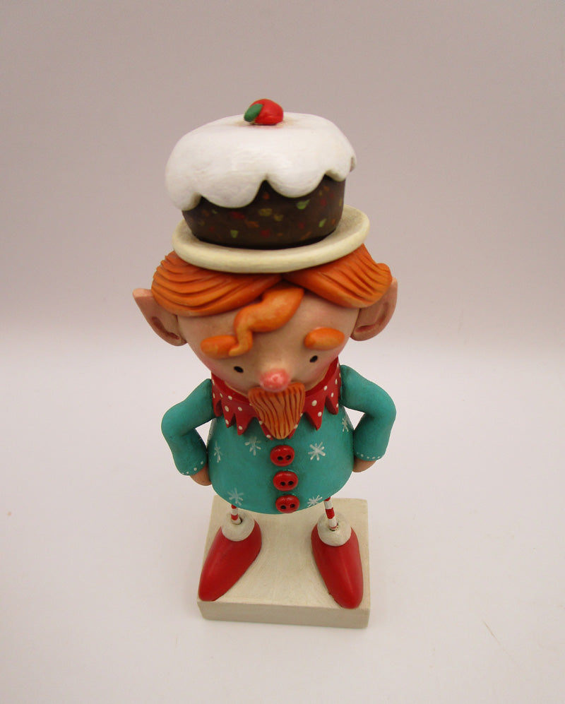 Nothing screams Christmas festivities than a fruitcake! I meant the cake, not the elf. This character stands 5.5 inches tall. He delivers this fruitcake balanced on his head! The fruitcake has a glossed up icy top and a cherry. The elf has a decked out outfit of red and teal with polka dots and stars. Check out his stance! And you gotta love those pointed ears.