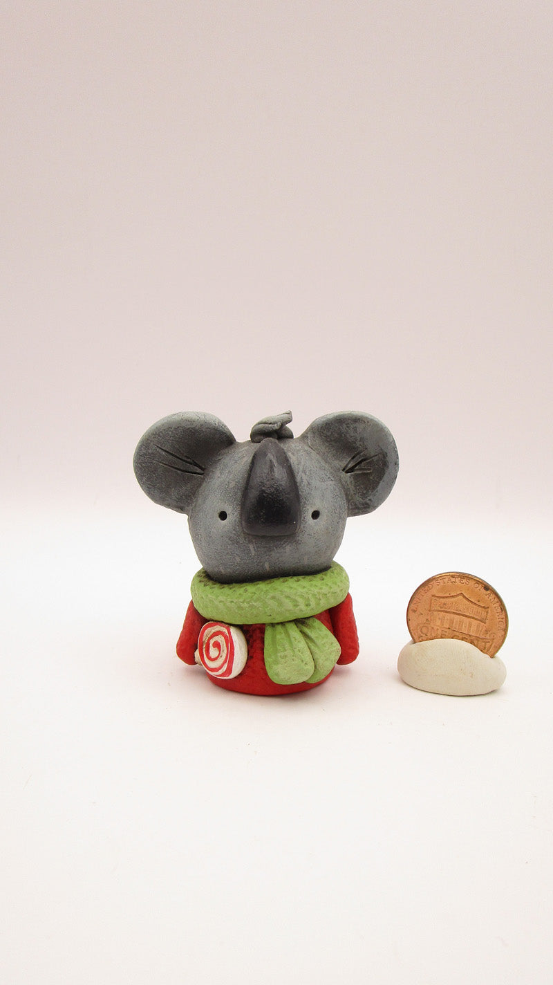 Christmas folk art little koala bear! This piece stands 2 inches tall. He's small but not a mini. In one hand is a Christmas lollipop. The scarf is textured and big black nose is glossed. Love!