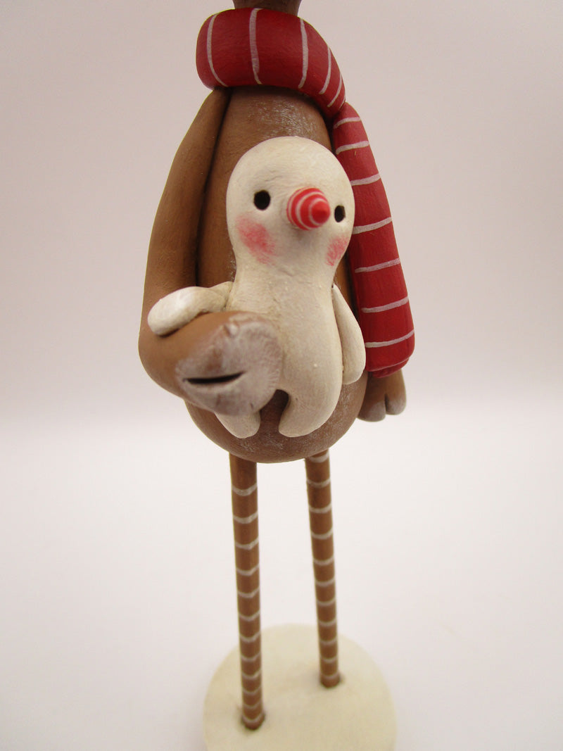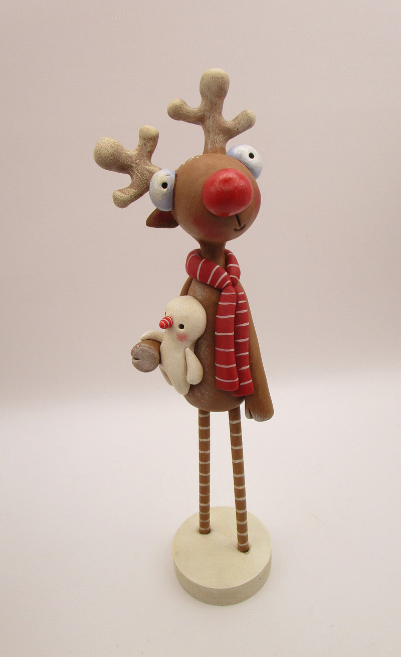 Christmas folk art reindeer with wood striped legs holding a reindeer friend! This piece stands 8.25 inches tall. He's got really cool antlers, big glossed up eyes and of course, that big red shiny nose. In one hand is a snowman with a tiny red and white striped nose. The base is hand cut wood with a slight light blue splatter.