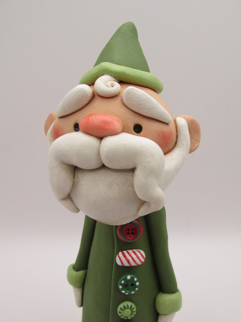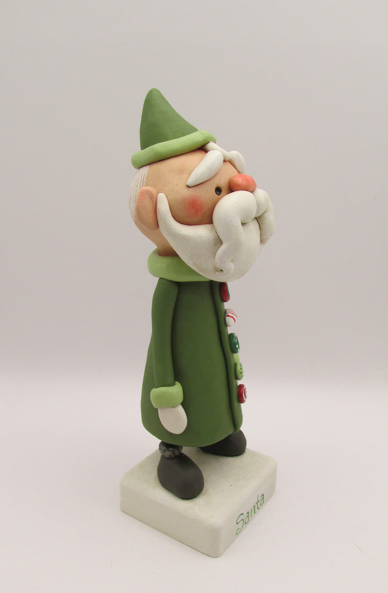 Melt your heart Santa! This 6.5 inch tall Christmas folk art Santa wears an olive green jacket with lots of fancy buttons. He's got a big lovely mustache and a little swirl of hair peeking out from his hat. The base is hand cut wood with simply "Santa" painted on it. Lovely piece!