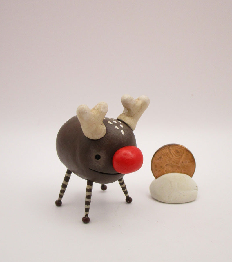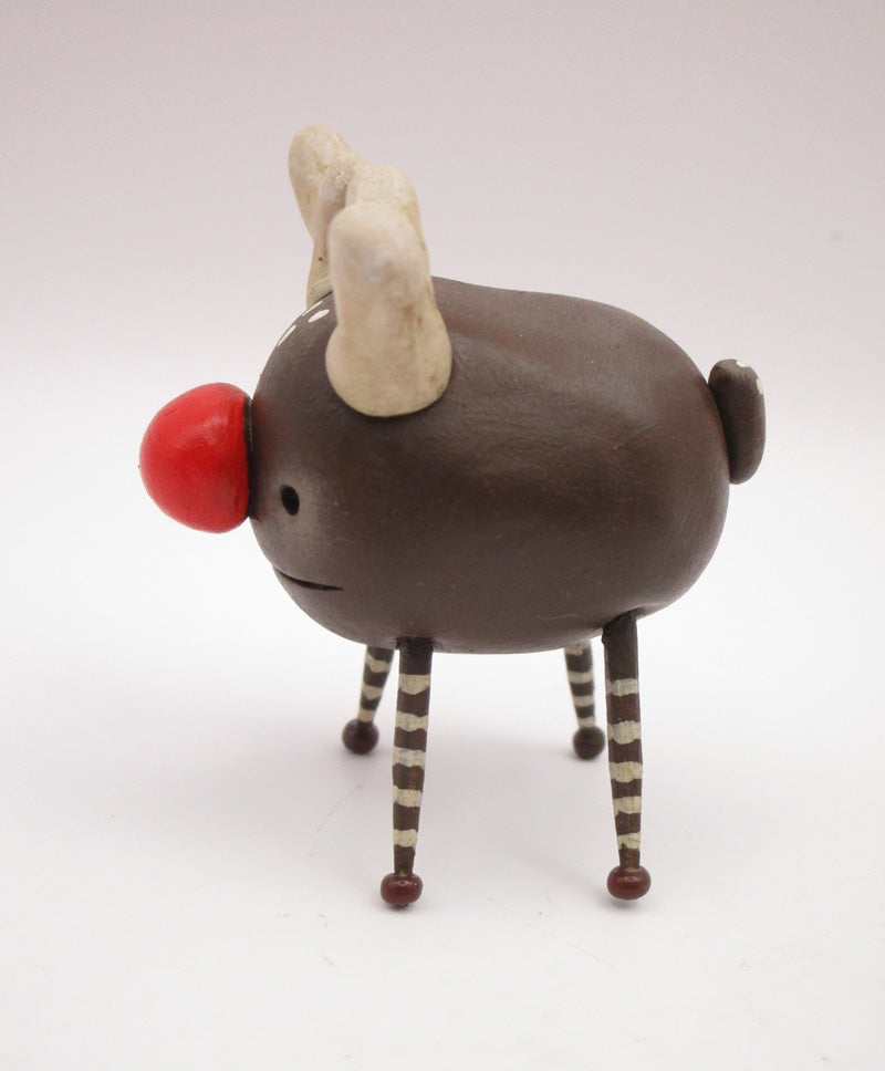 Sold the first one and because I loved him so much, I made another! This one a bit different than first. The reindeer stands a total of 1.75 tall. He's got chunky style stubby antlers, a big red nose and wood legs with glass beads as hooves.