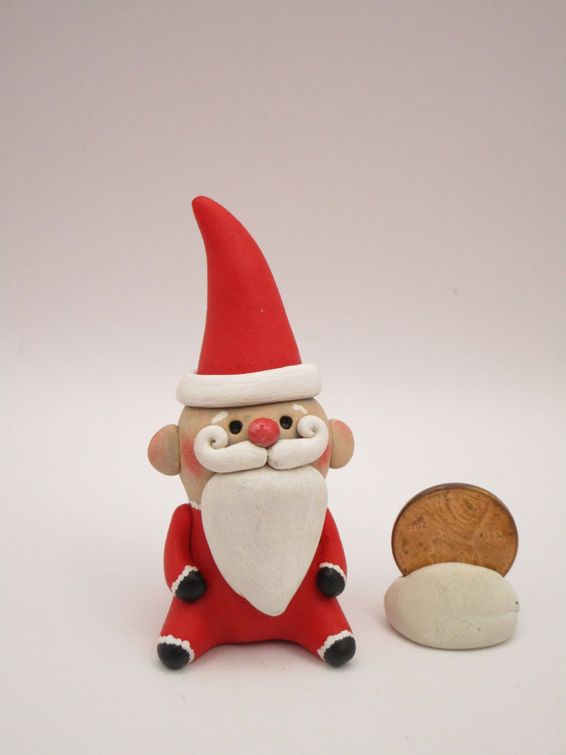 Adorable small Christmas folk art sitting Santa Claus! This festive fellow sits tall at just 2.5 inches. He's dressed in traditional red with black mittens and black "shoes". I glossed up that tiny red nose.