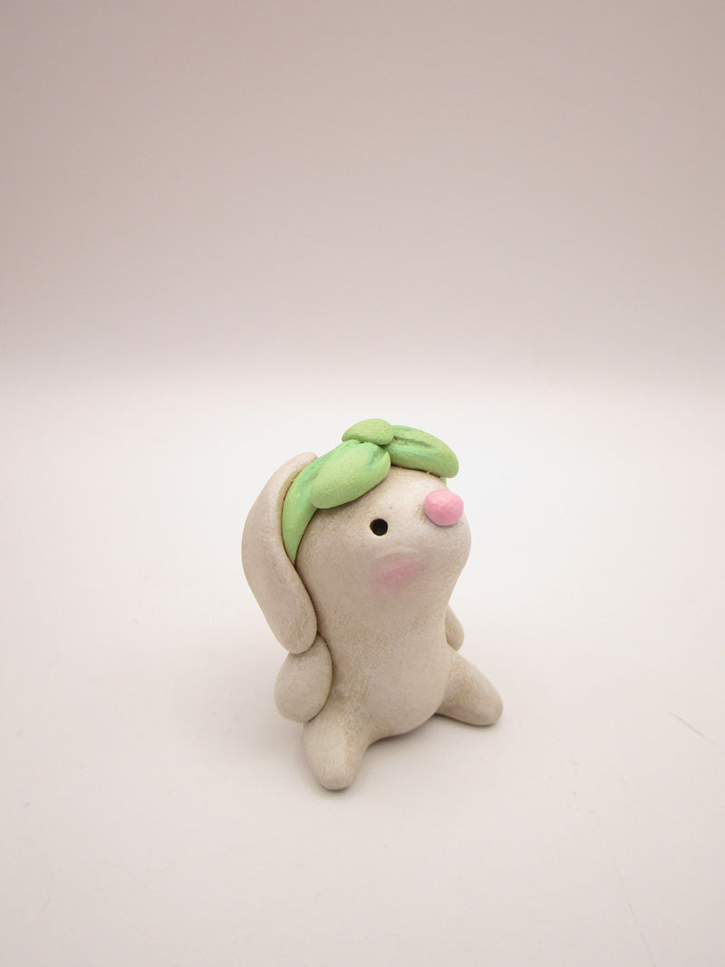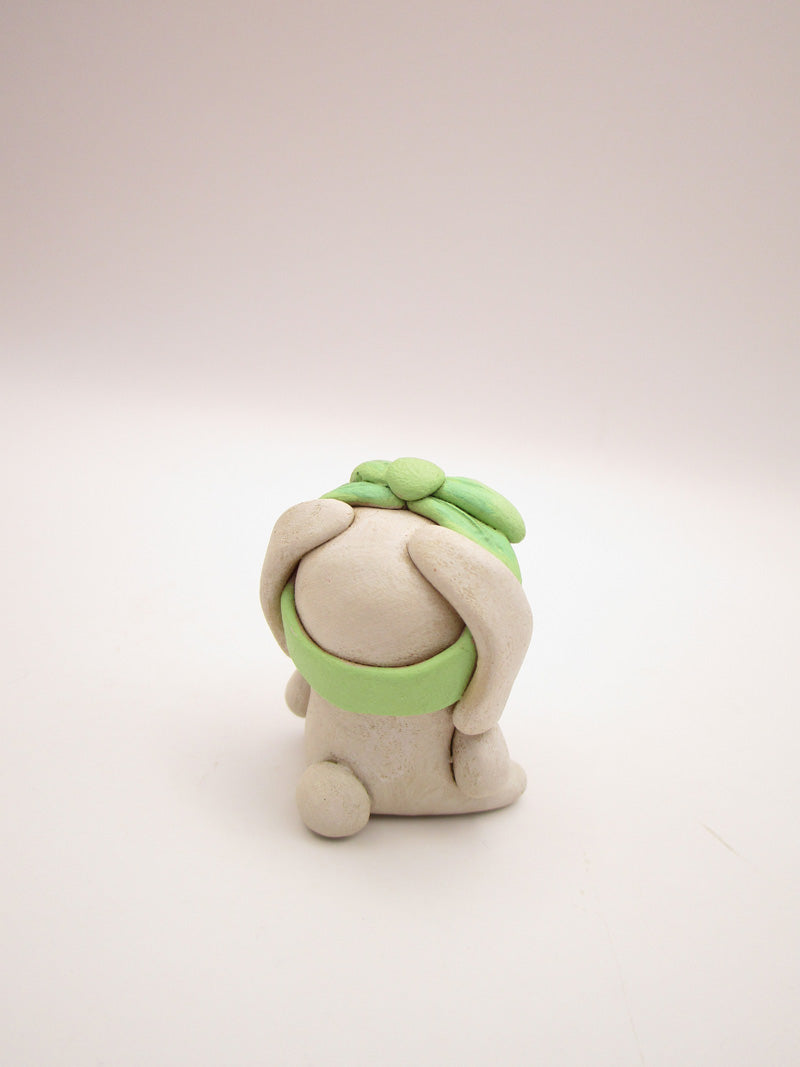 Just 1.5 inches tall, check out this cute little Spring folk art, Valentine bunny or Easter! She was painted in two tones of cream paint, given a fun minty green wrap around scarf-bow and a pink nose.