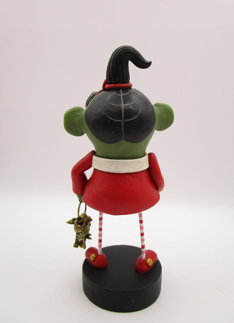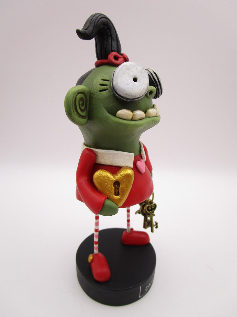 Super cool Valentine Zombie! This girl stands 5.5 inches tall from the wood base to the top of her red ribbon trimmed pigtail. Fun features include the red dress with pink polka dotted underpants, the big textured glossed eyes, wonky teeth and swirl style ears. The theme here is KEY TO MY HEART with the gold painted heart and super cool brass key ring with 6 tiny keys.