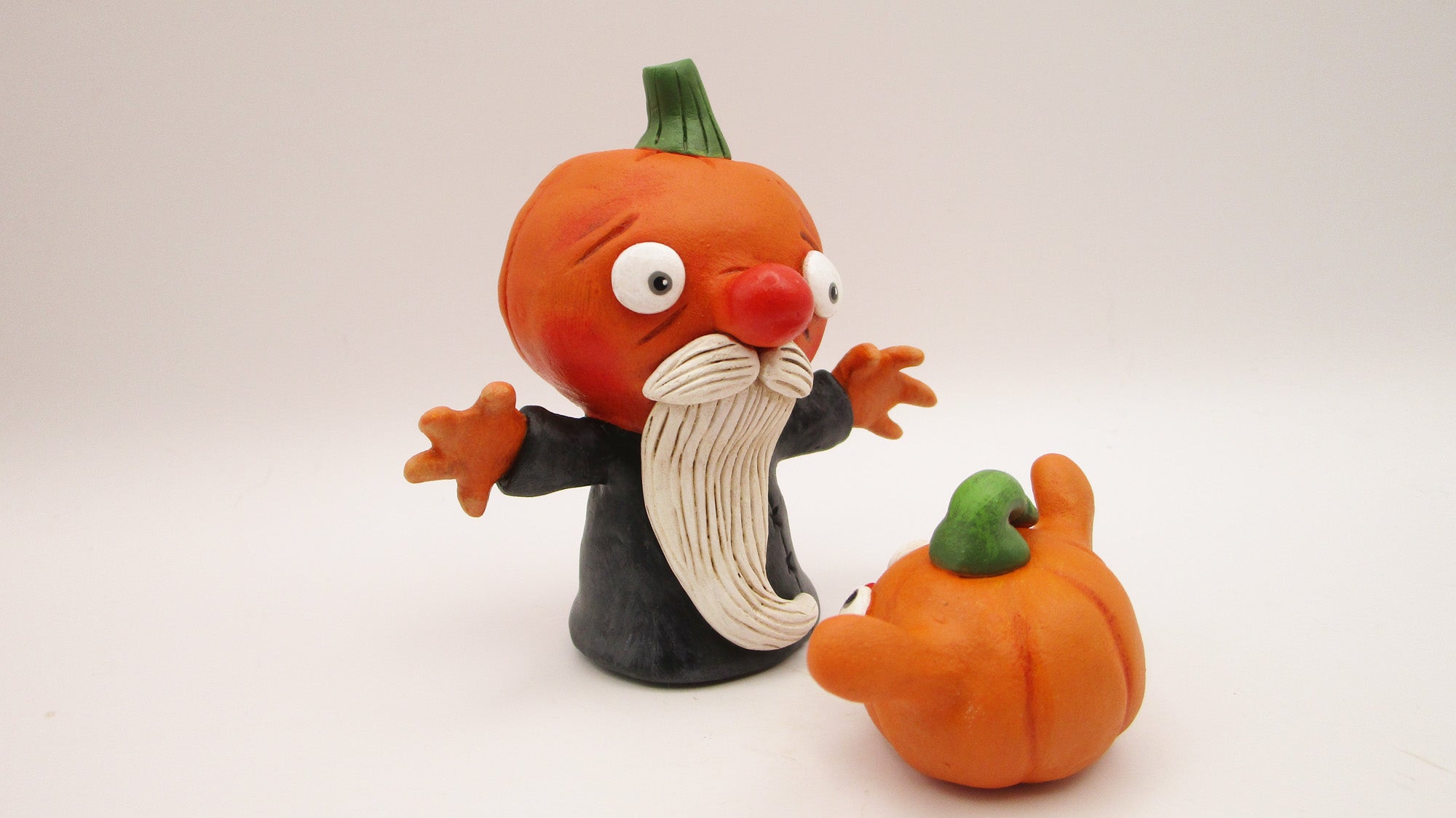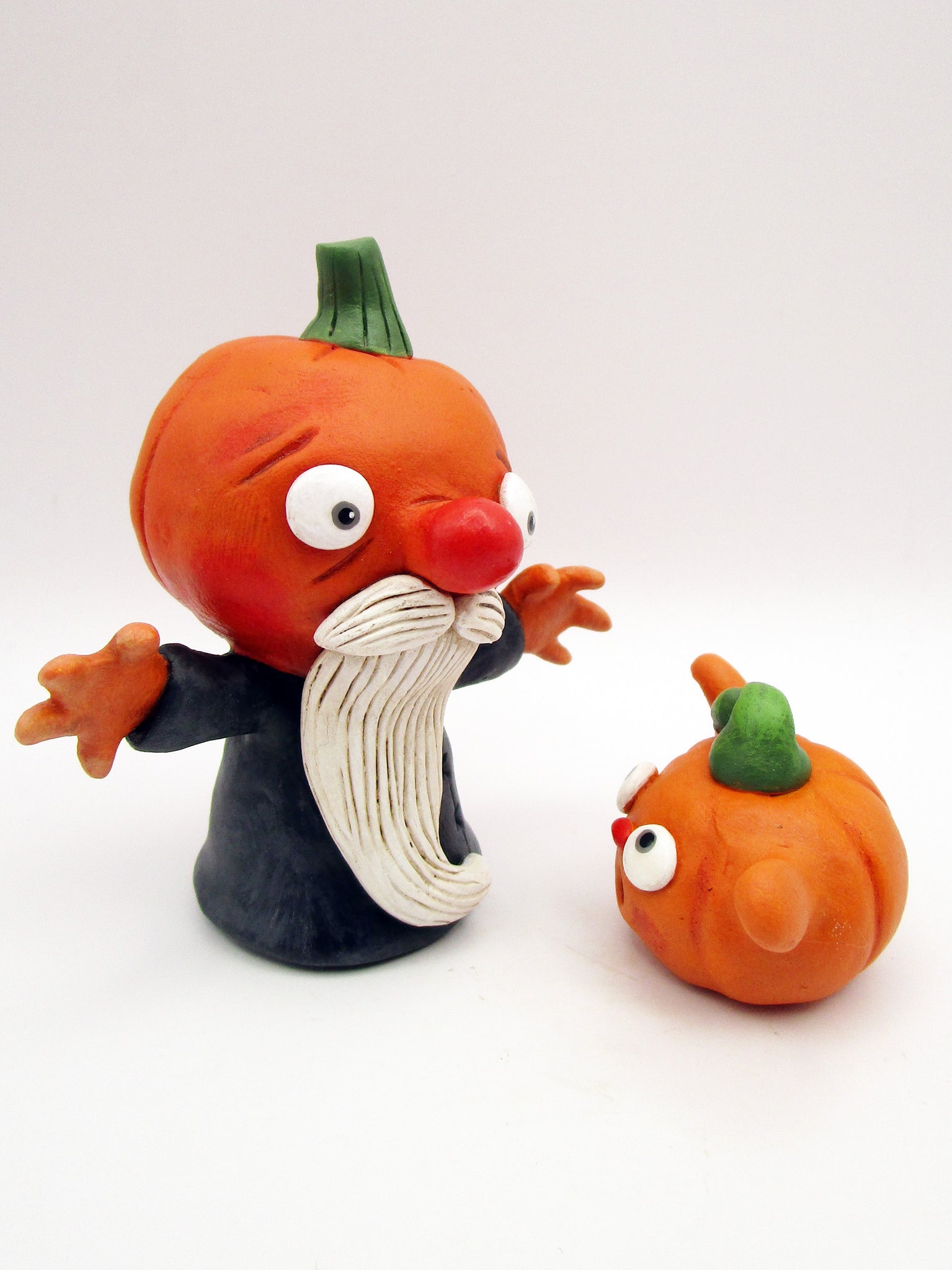 This idea came from a vintage Halloween postcard! This is a two-piece set. The grandpa pumpkin man stands 3.25 inches tall and the little pumpkin boy just shy of 1.5 inches. Both character have outstretched arms with grandpa having fingered hands. Old man wears a black and grey stitch style jacket. Both piece has glossed up painted eyes.