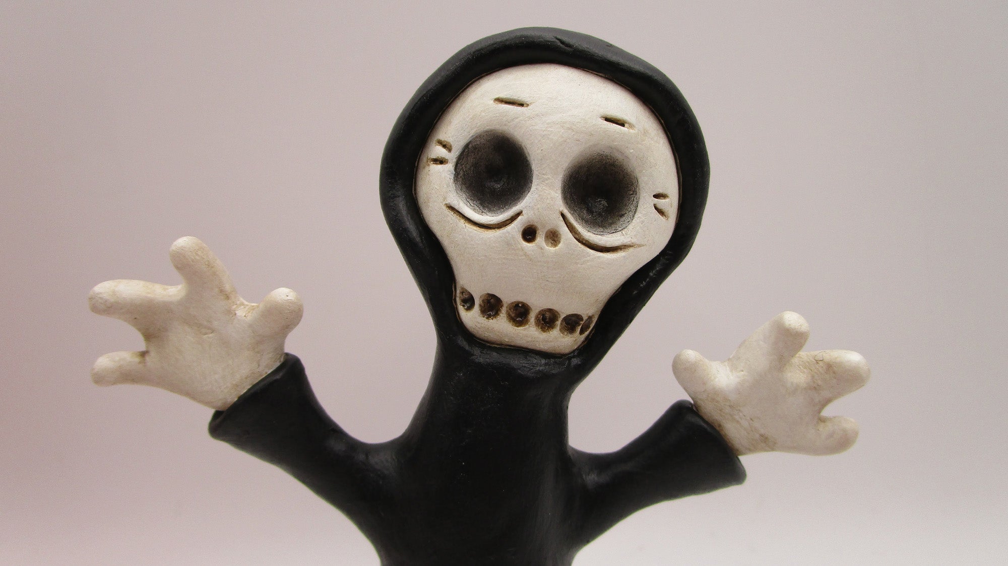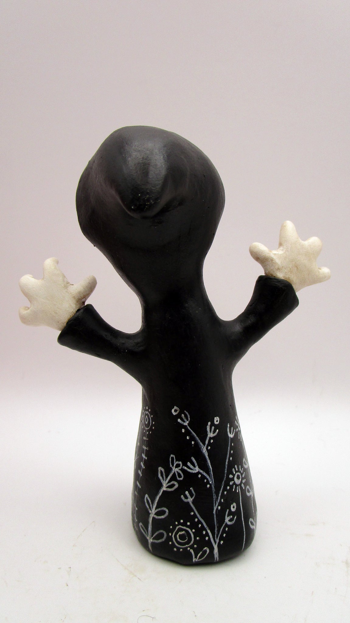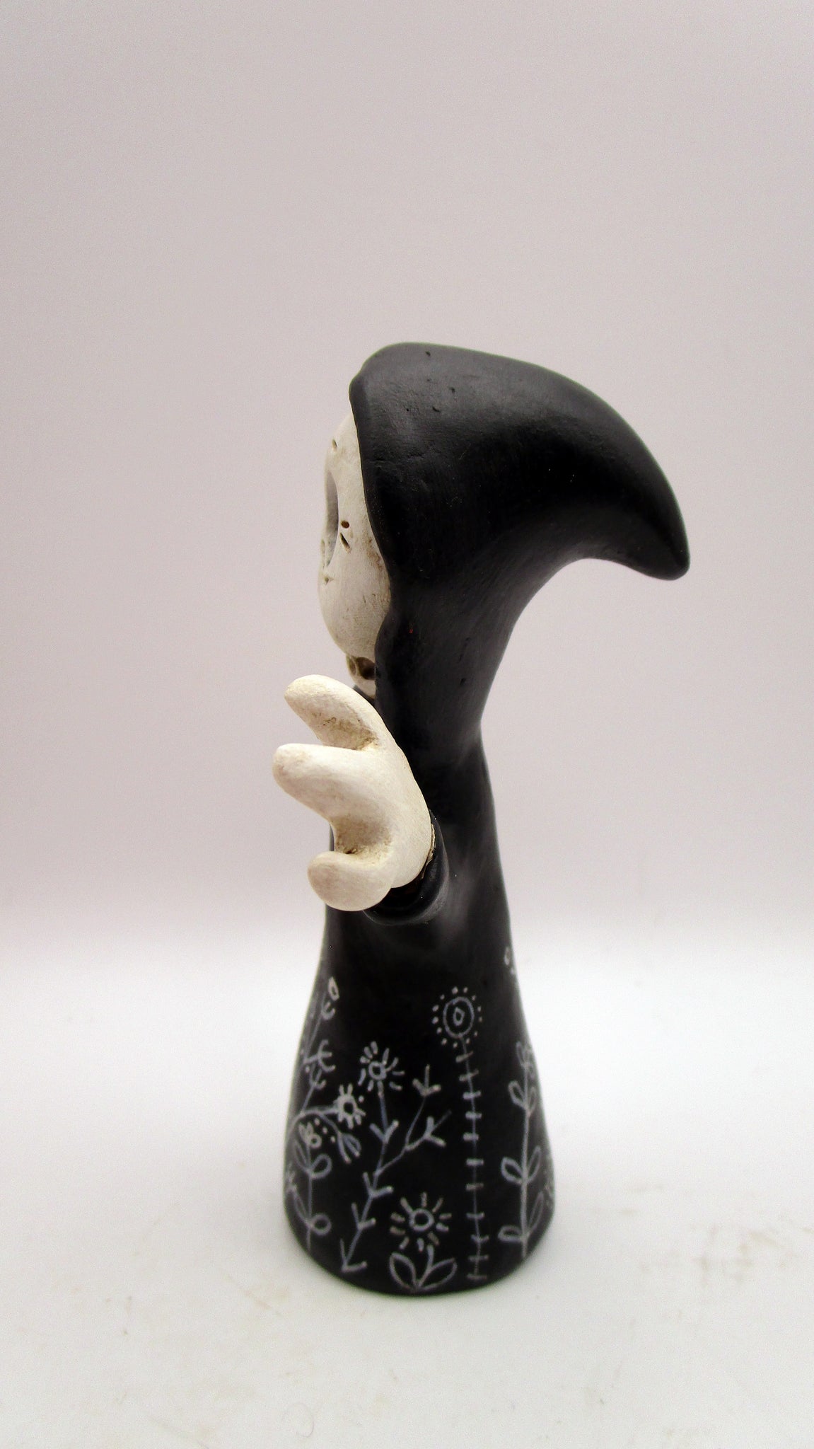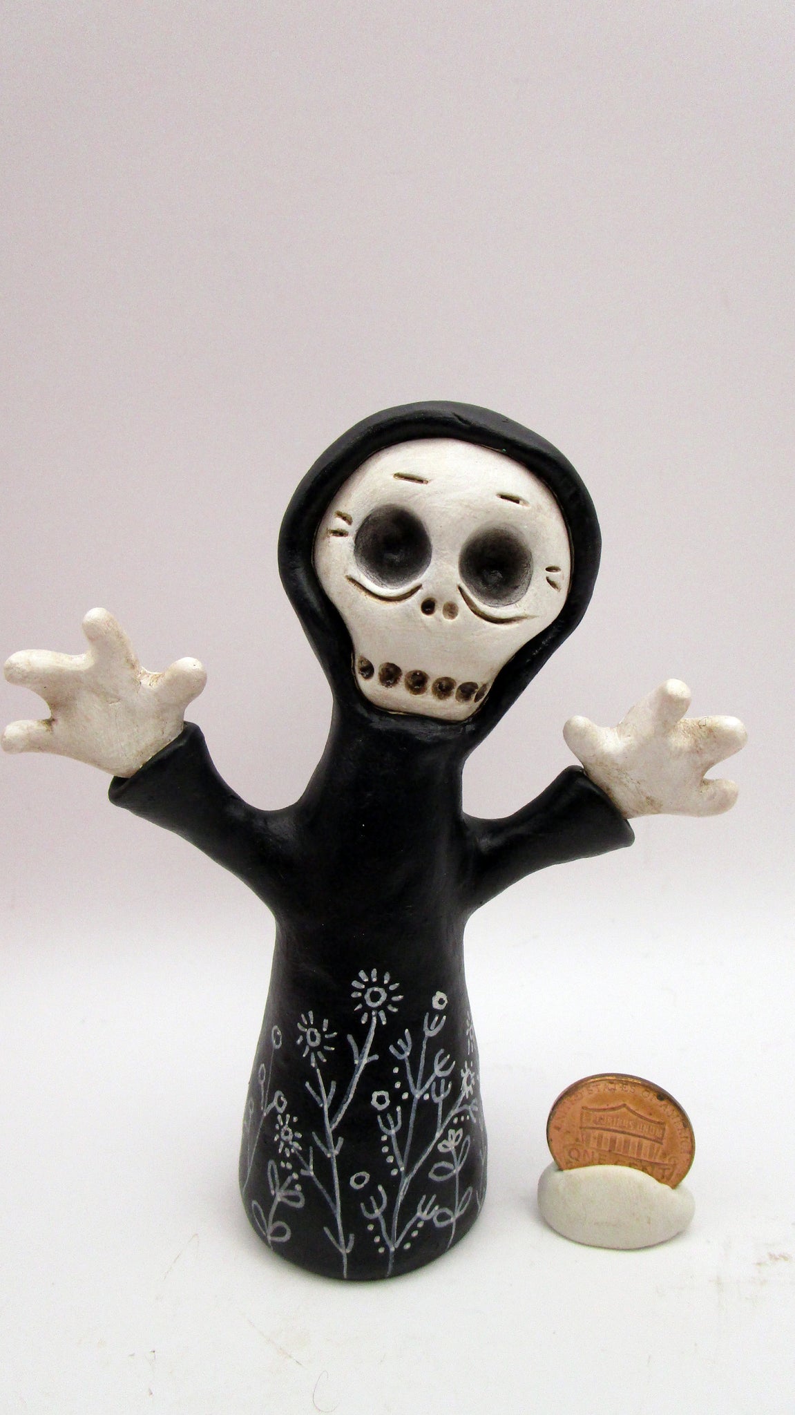 Spooky Halloween folk art ghoul dressed in a black cloak! This adorable fellow has spooky hands, a floral doodle cloak and sweet skelly face. He stands 4.25 inches tall.