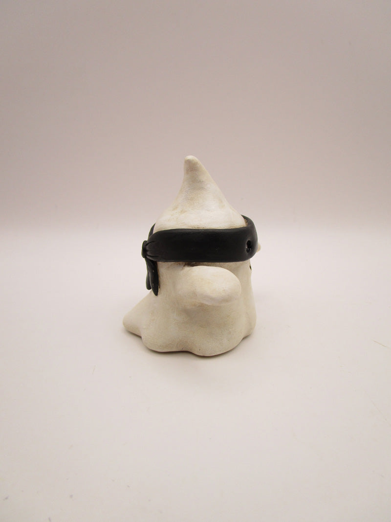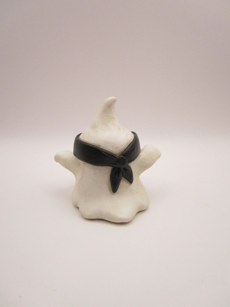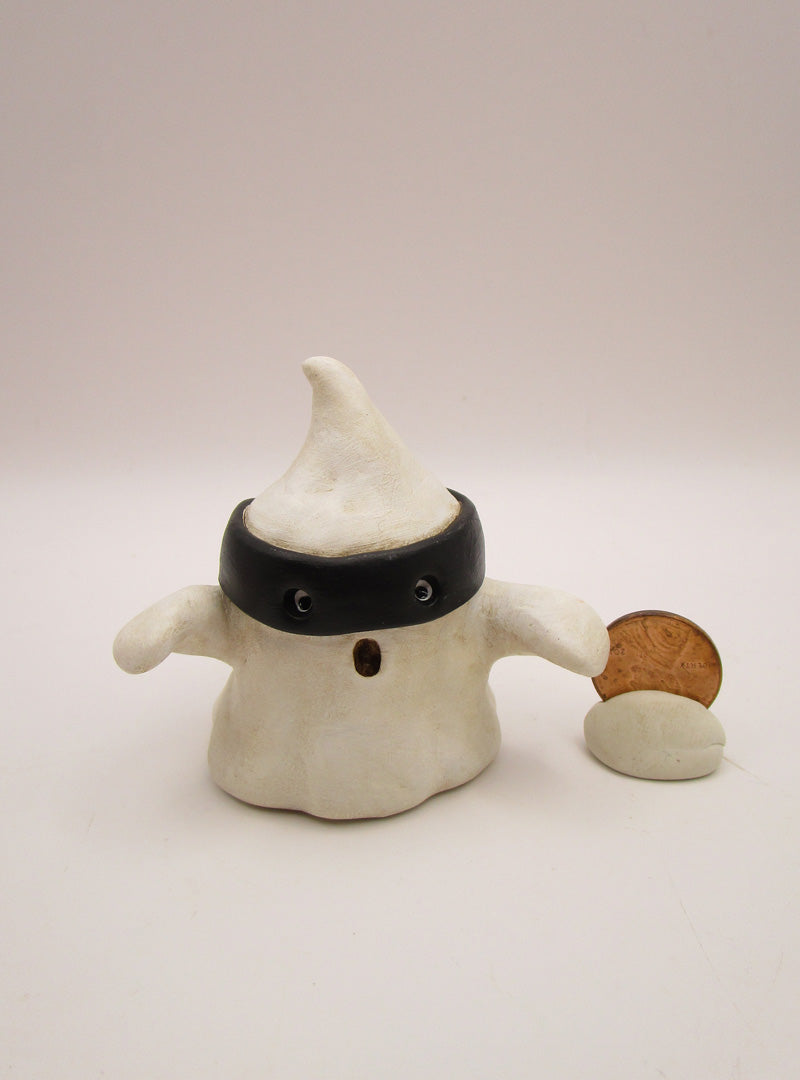 Halloween folk art spooky 2.5 inch tall and same across black masked ghost. This cute spooky friend has inset "wet" eyes and outstretched arms. This would make a great addition to anyone's Halloween collection!