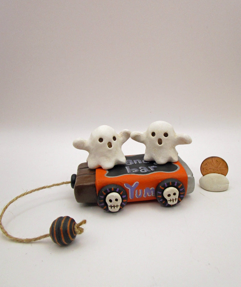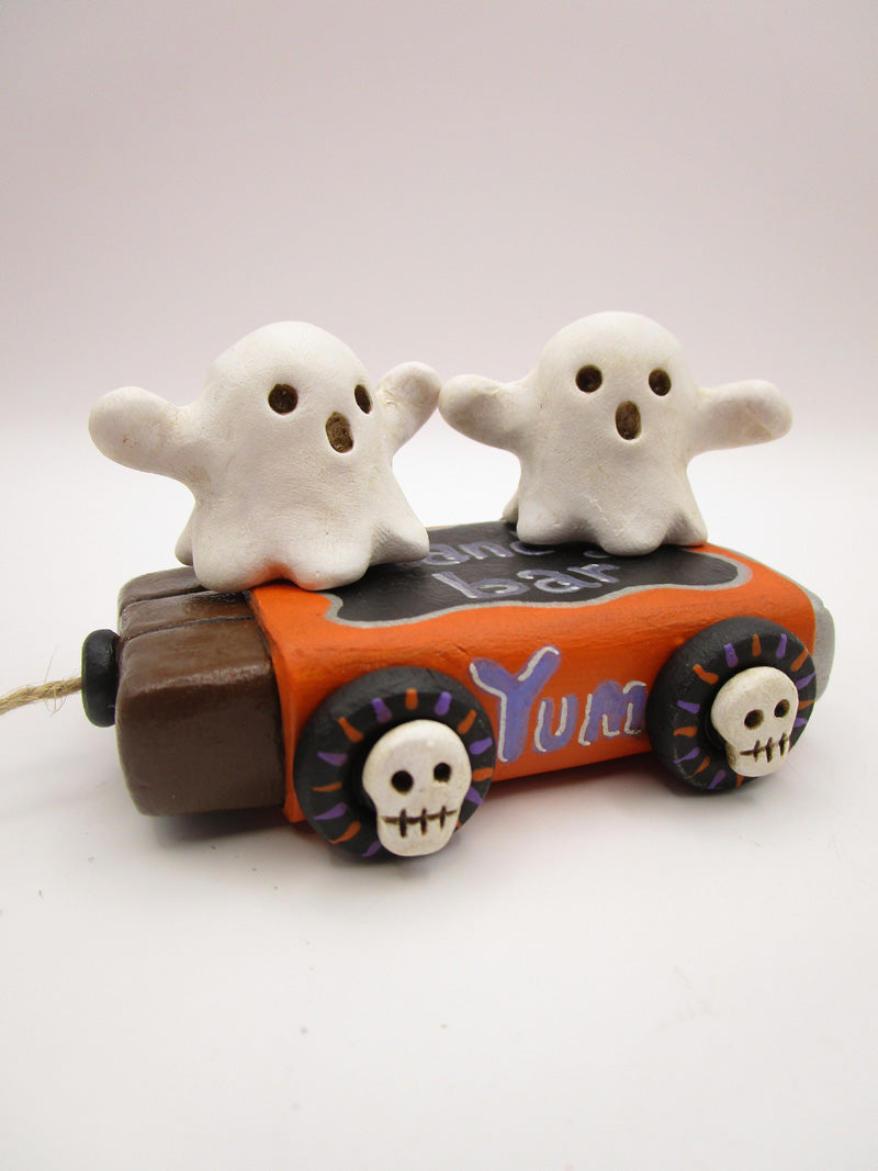 Halloween folk art two little ghosts riding on a Halloween candy bar with wheels. This stationary piece measures 3.25 wide by 2 inches tall. The wheels have sculpted skulls with some painted stripes. Unique piece!