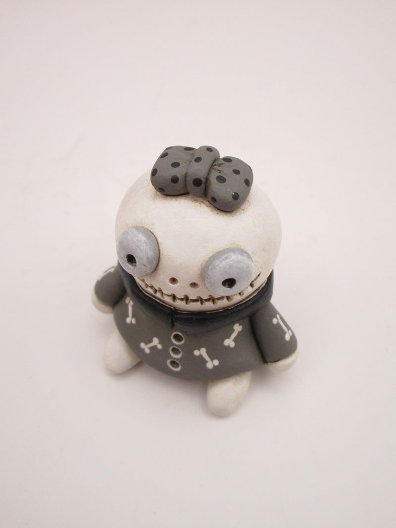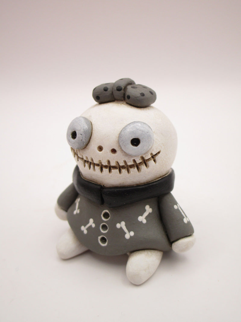 Just 1.75 inches tall! Halloween small and ever so cute skeleton girl with stitch mouth, glossed up eyes, bow to match bone dress!