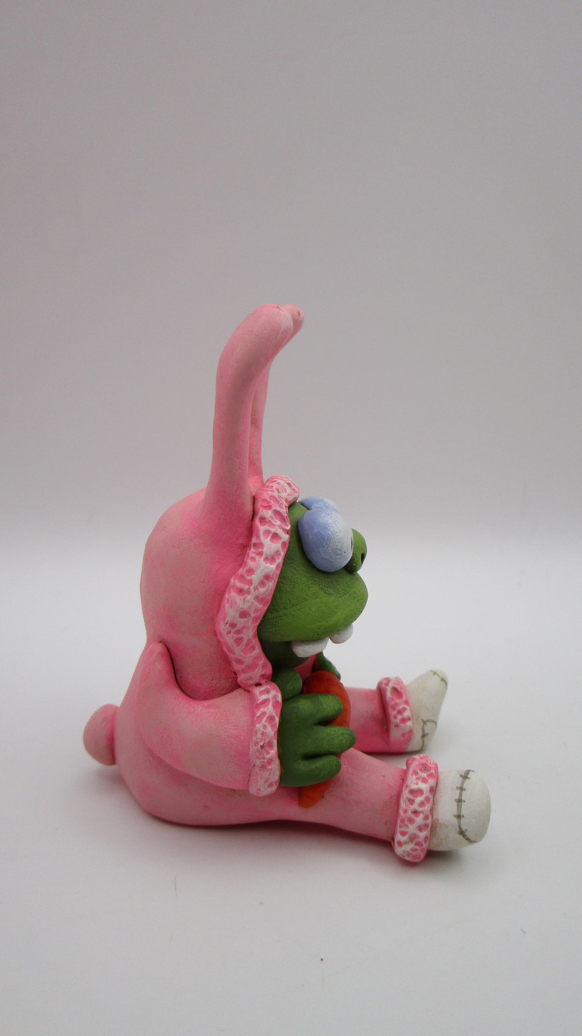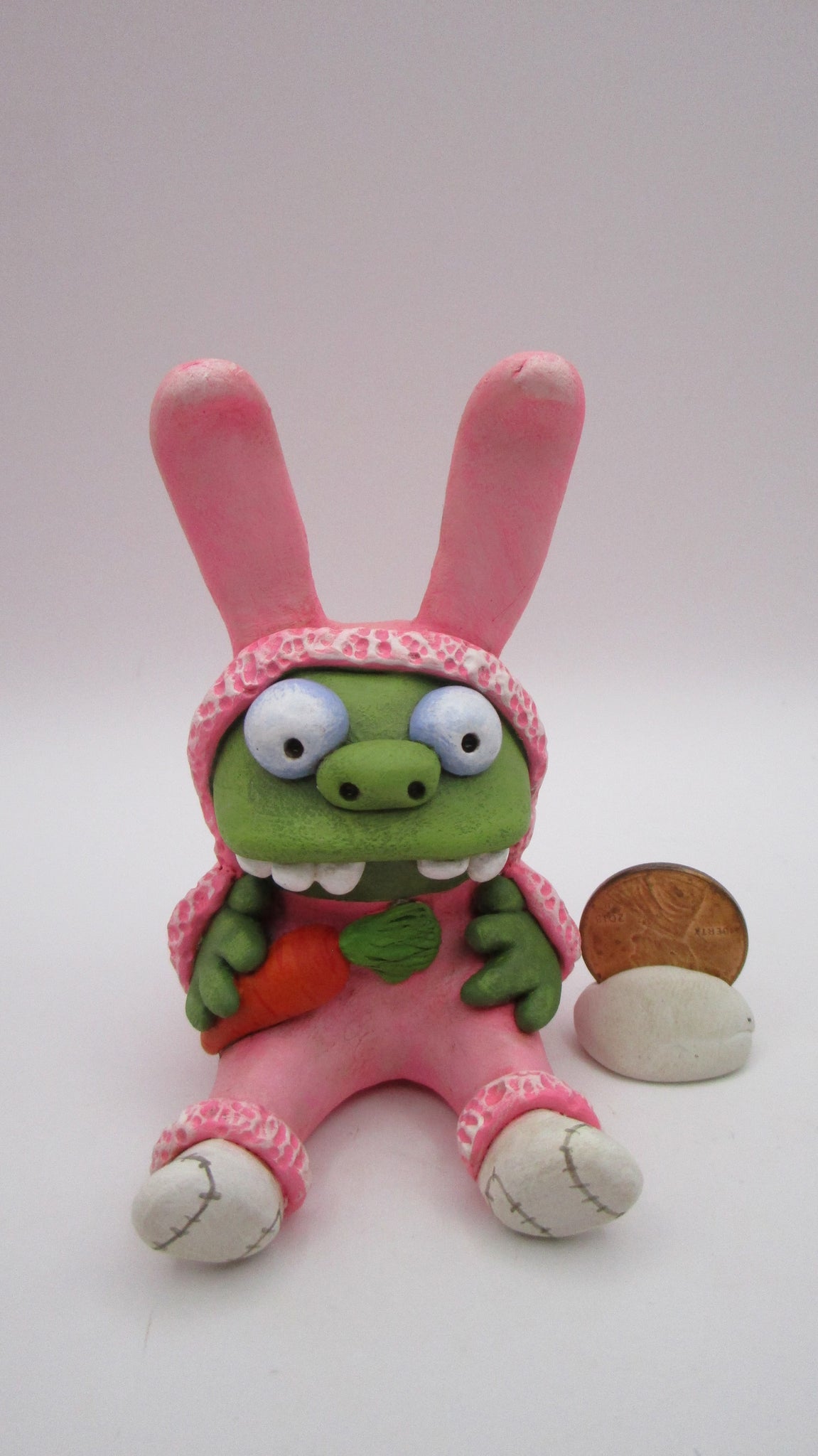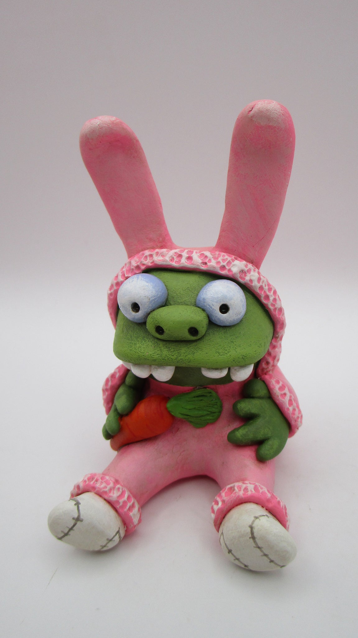 Oh what fun! Check out this silly Easter zombie wearing a funny bunny costume! This fellow sits holding a little carrot. He's got big glossy eyes and wacky teeth. Best part? Oh those socks of course! This piece measures 3 inches tall from butt to top of ears.