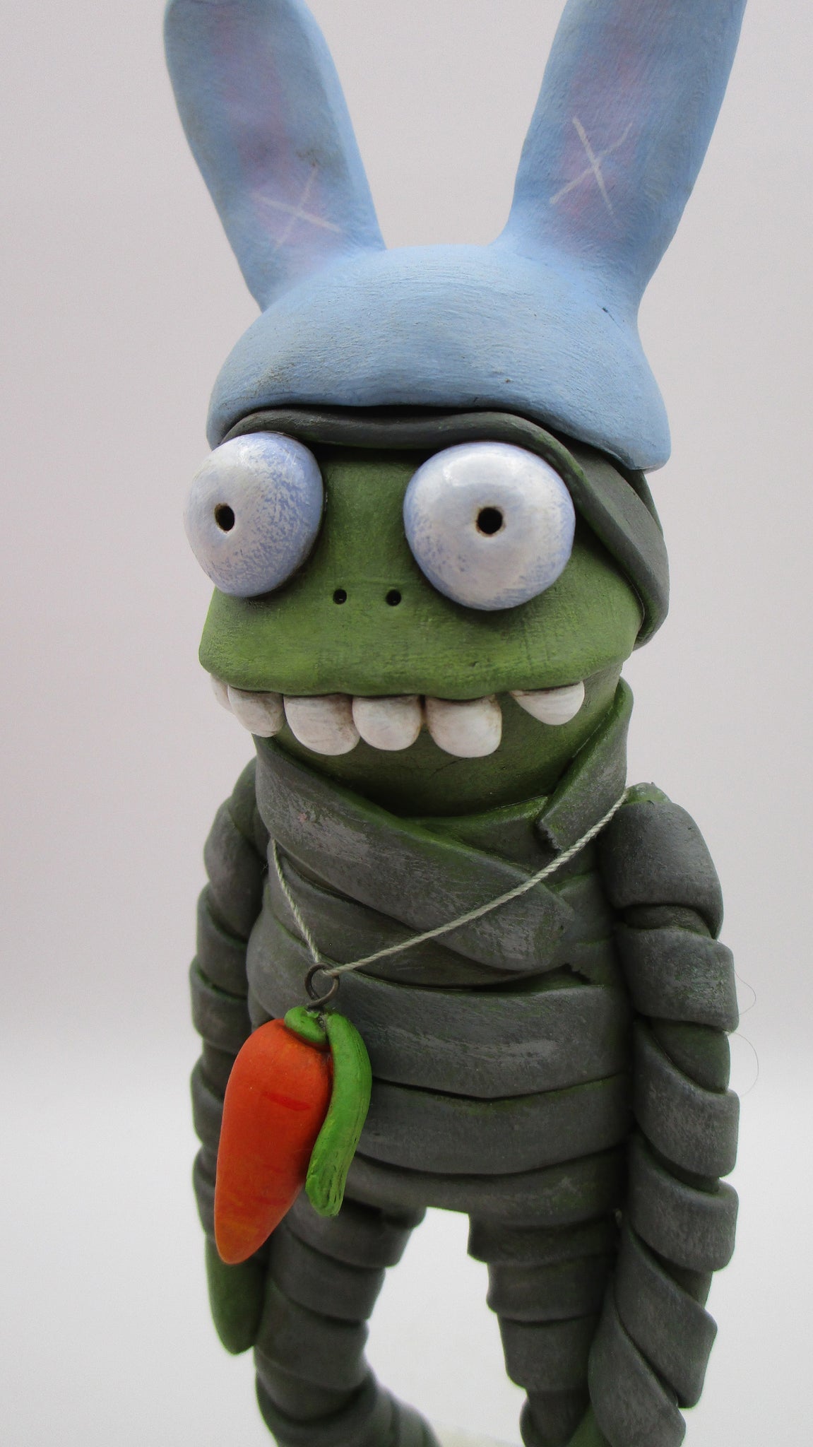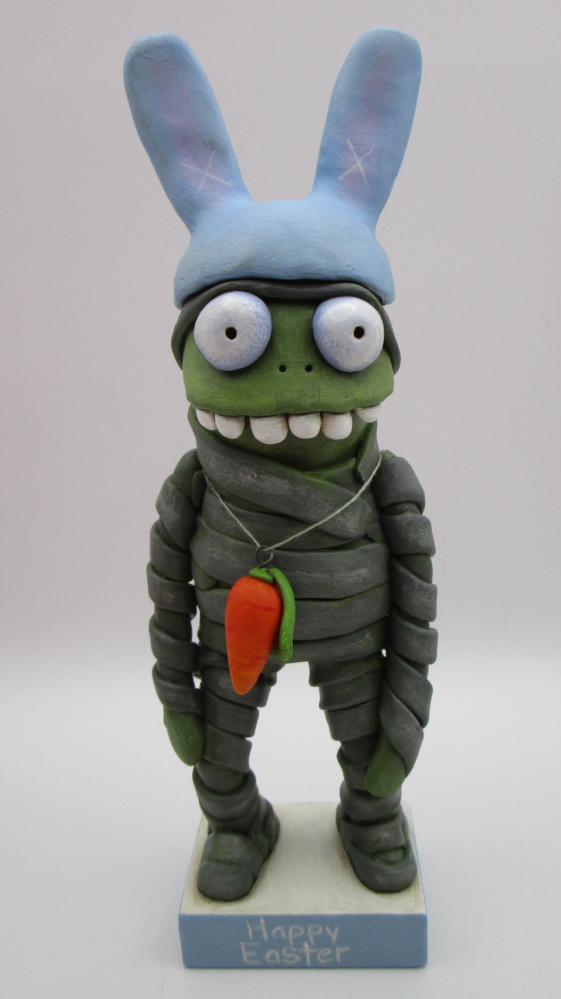 This adorable Easter monster stands 7 inches tall from base to top of bunny ears. Mummy zombie monster has a wrapped-up style body, big glossy bug eyes, wacky teeth and OH that bunny hat! Around is neck is a carrot necklace. The base is hand cut wood and simply reads "Happy Easter". And check out that stance...
