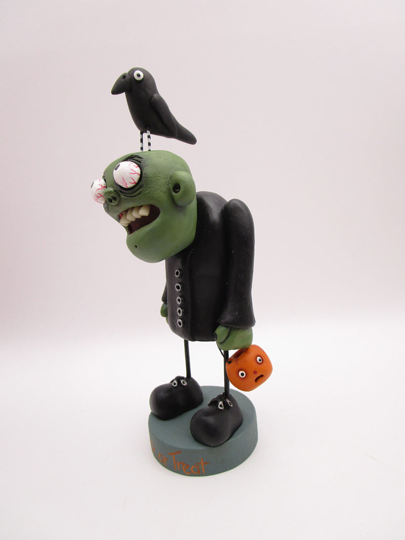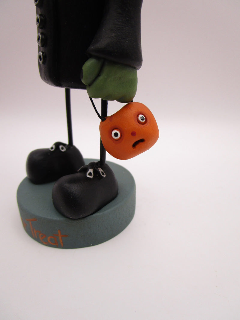 Very fun piece! This 6-inch-tall Halloween folk art character is similar to that "Igor" character from our past. This is my version. He's got a pesky crow on his head, big blood shot glossed up eyes, an upturned nose, GLOW in the dark teeth, many buttons down his jacket and in one hand is a creepy little pumpkin bucket. The base is wood and reads "Trick or Treat". Fabulous character! With any glow in the dark items, you simply hold the piece to a light source and turn off lights. The glow part last for about 30 seconds. Cool!