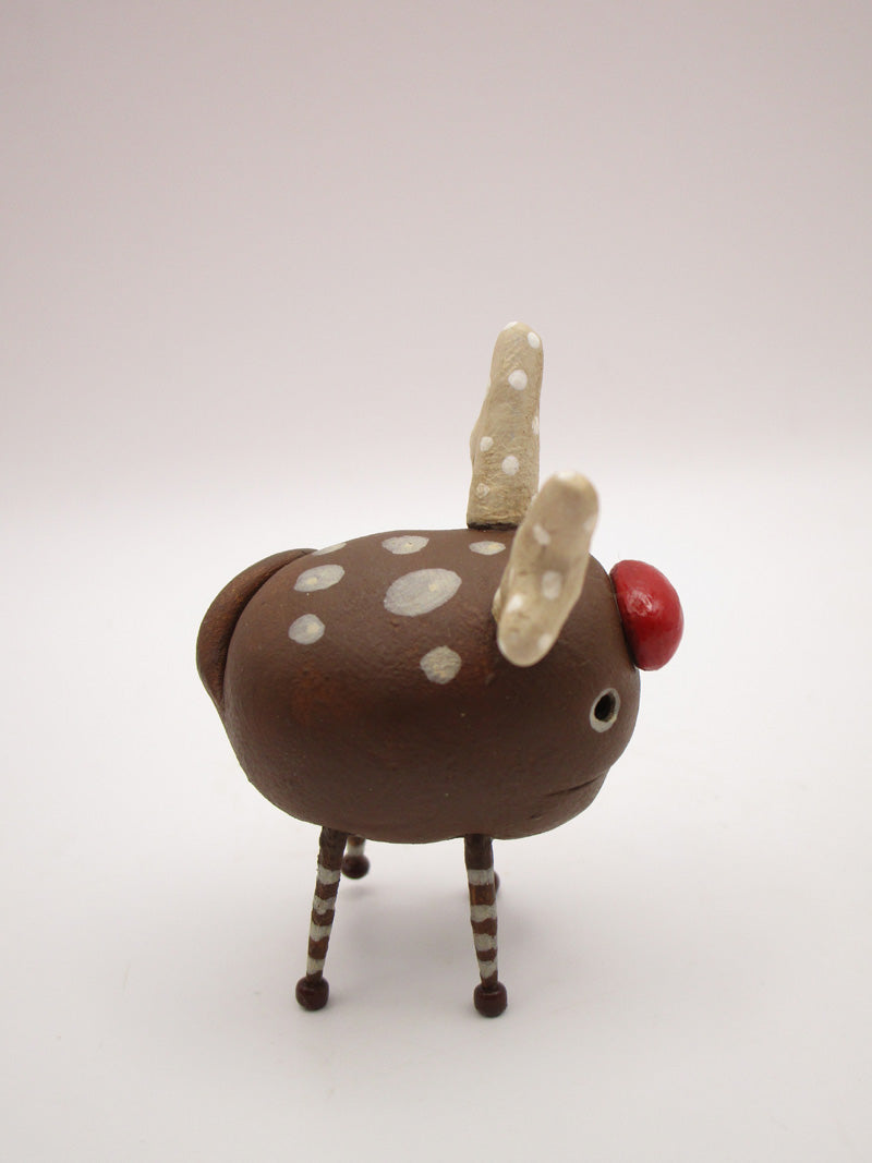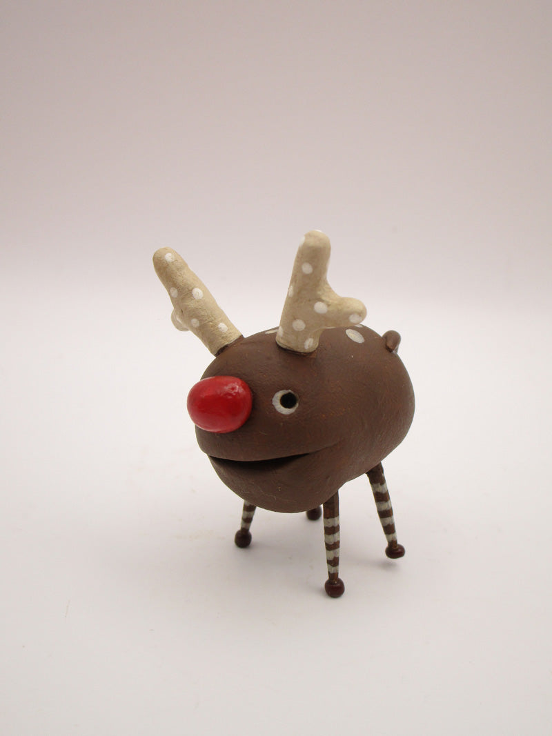 So lovable! This is a mini or just small reindeer monster character. He stands 1.5 and with antlers 2 inches tall. Each of his legs are wood with a tiny glass bead added. The antlers are polka dotted. Check out the red nose! This one won't last long....