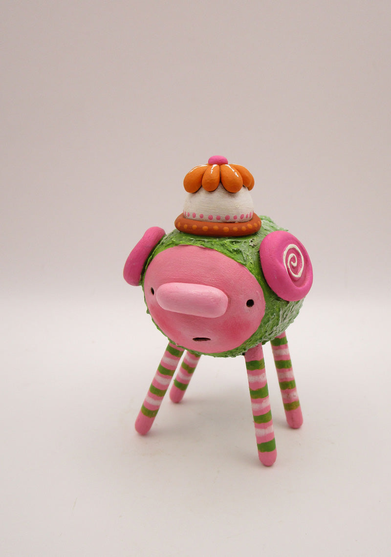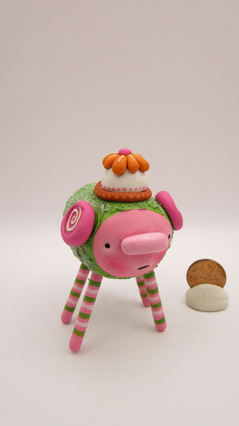 Adorable monster with four wood striped legs and lots of texture. I love these monsters! He stands 3 inches tall. Fun features are the swirl designs on the side of his head, like ears and the flower style hat. All the wood legs are striped.