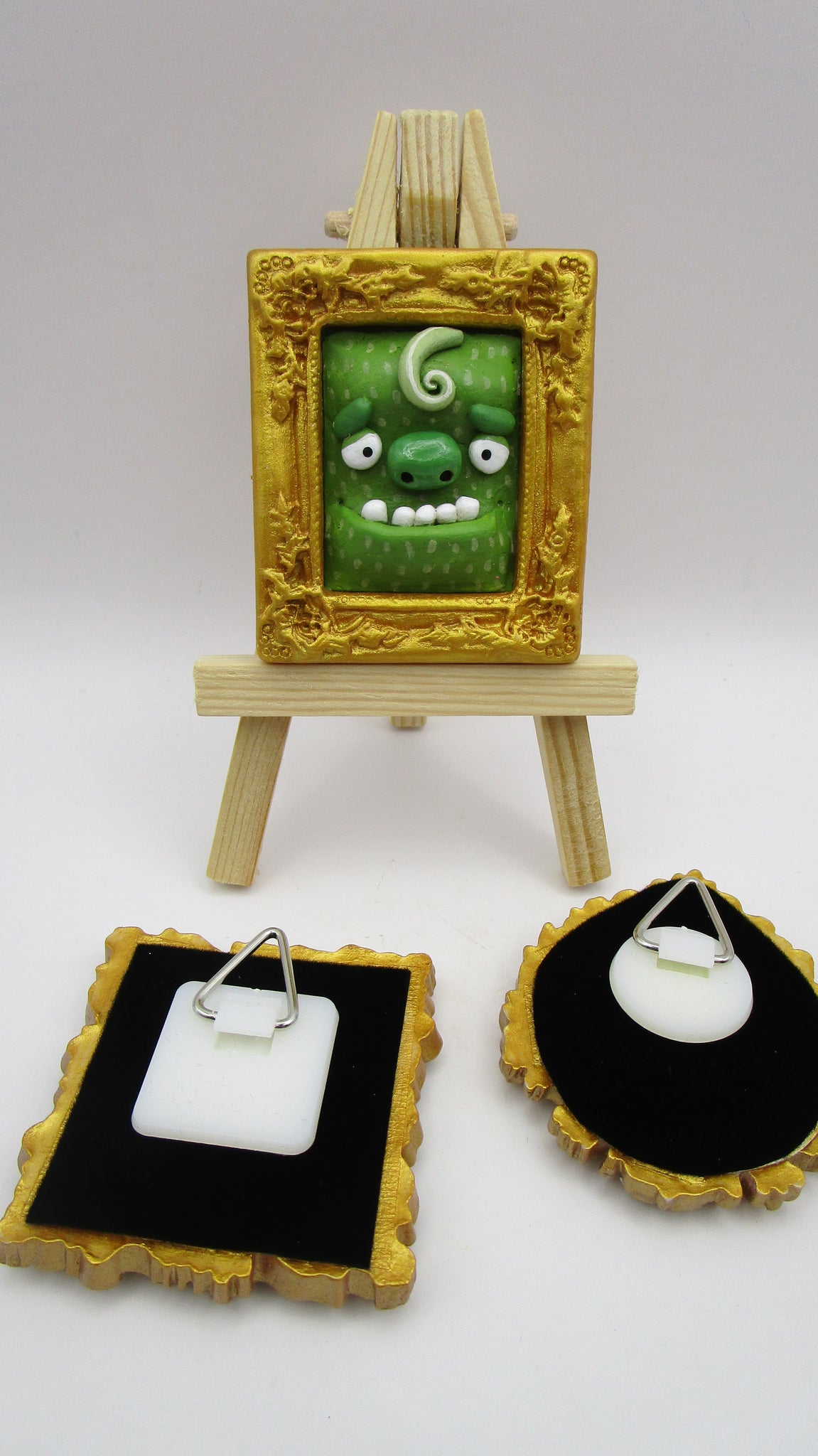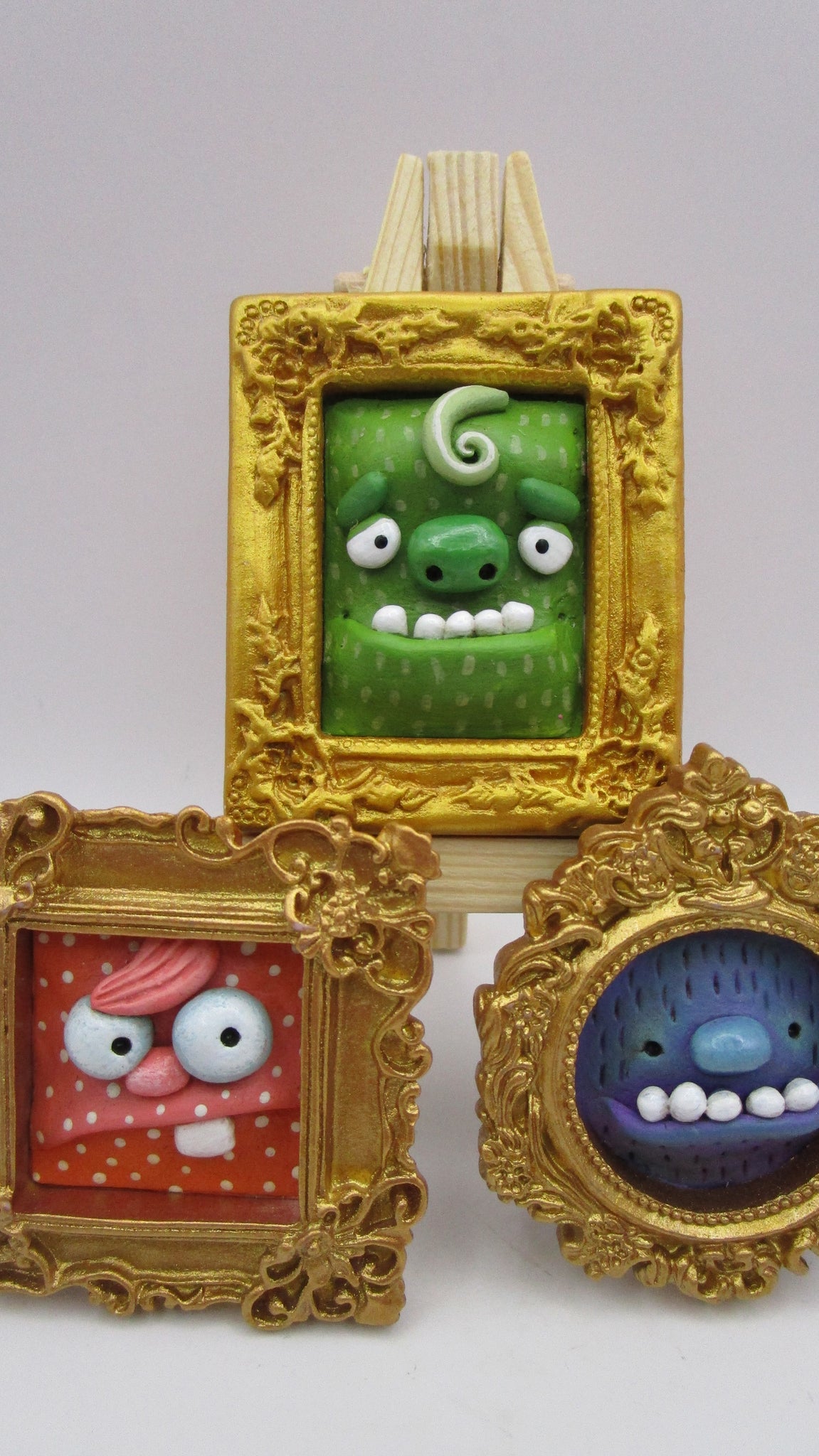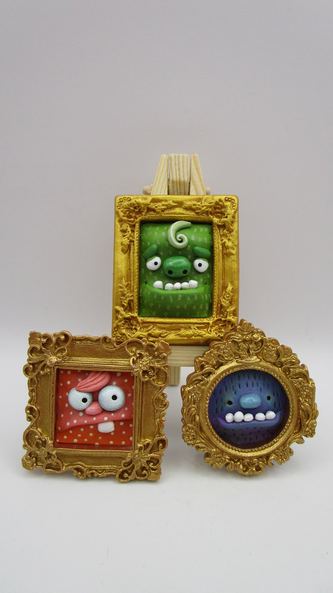 This is for all THREE mini gold framed monsters. Backs already have wall hook in place. This measure estimated 2 x 2 inches, give or take.