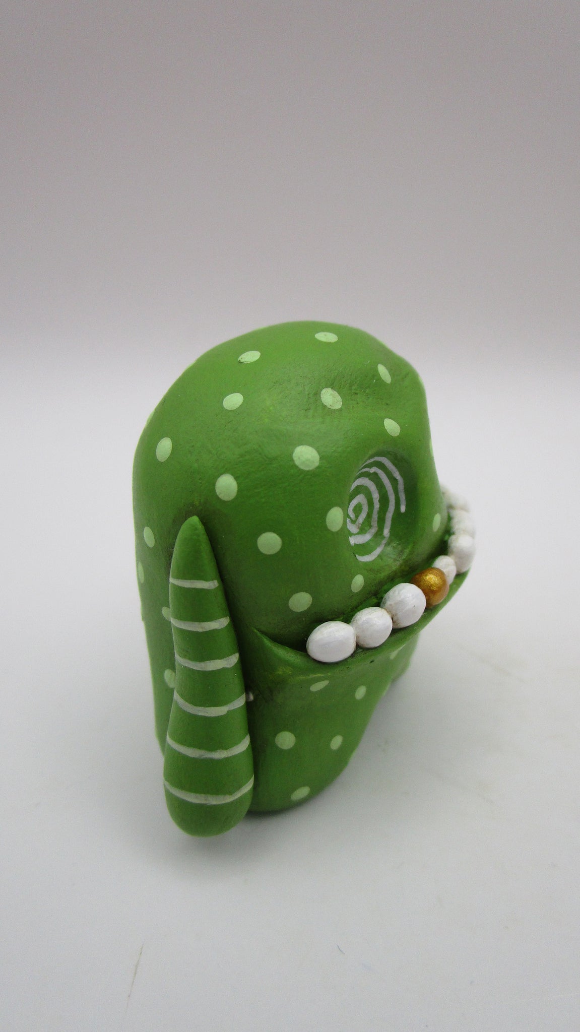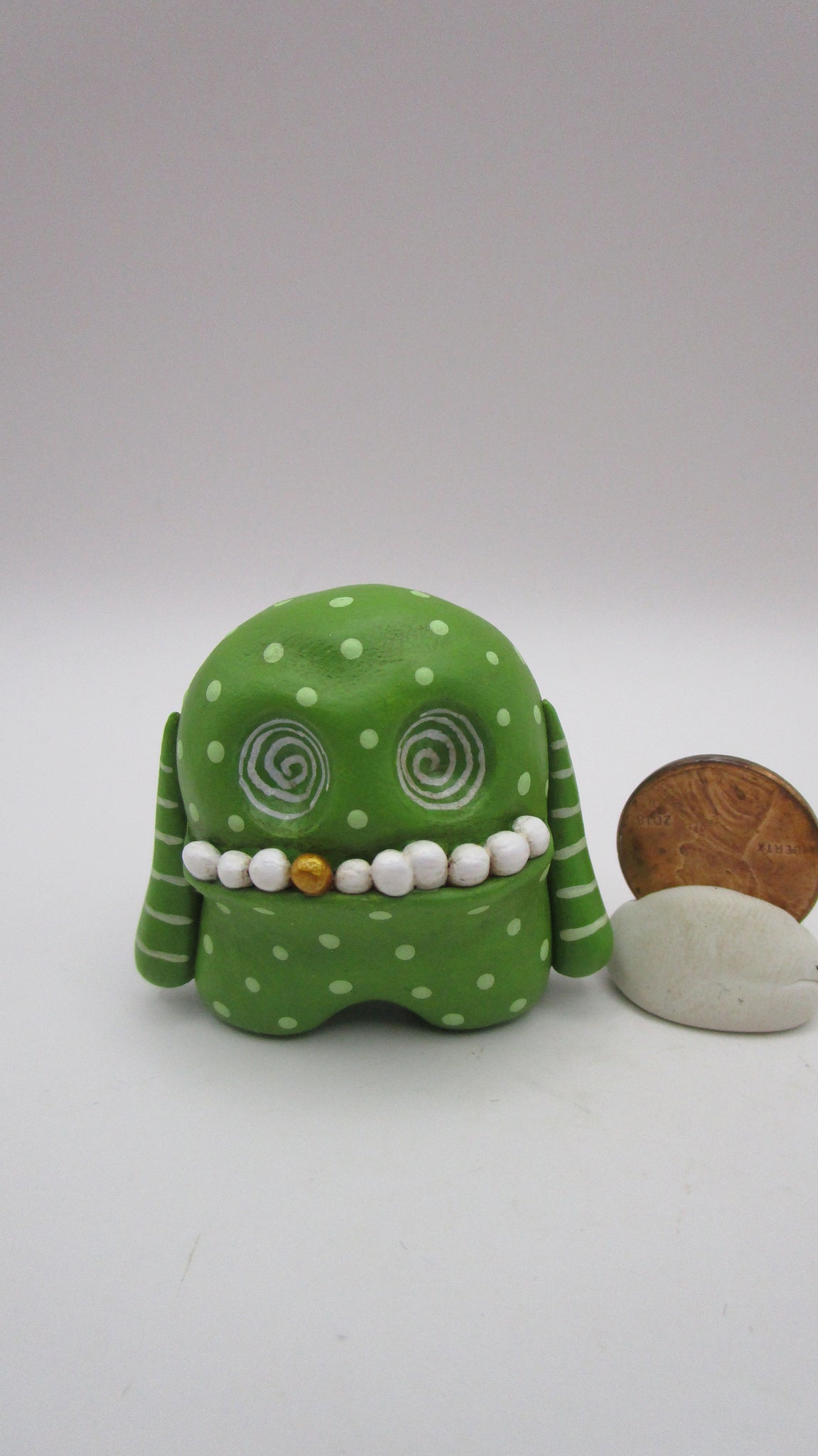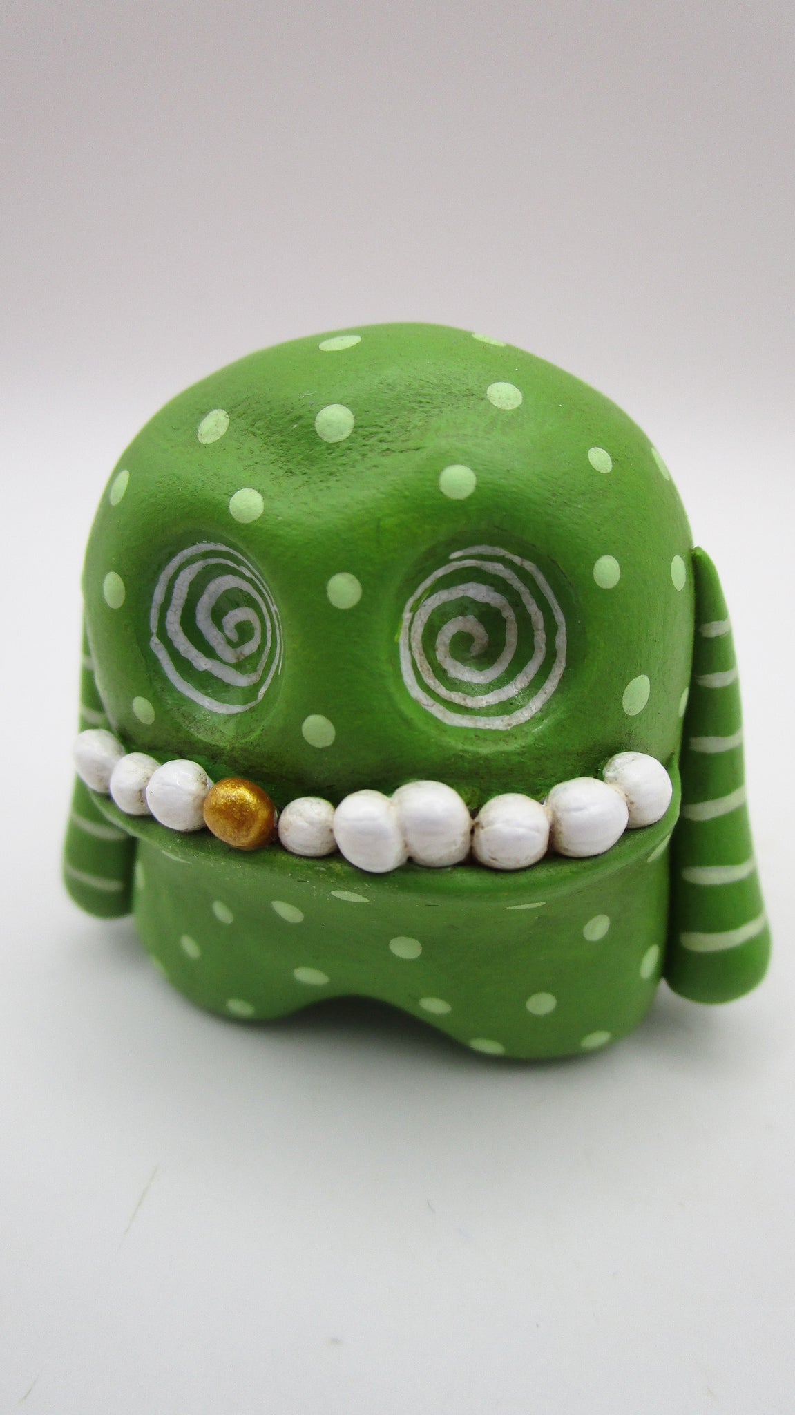 Small lime green polka dotted monster. This little cutie stands almost 1.5 inches tall. He's got wacky teeth and one being gold colored. Check out those inset swirled eyes!!!