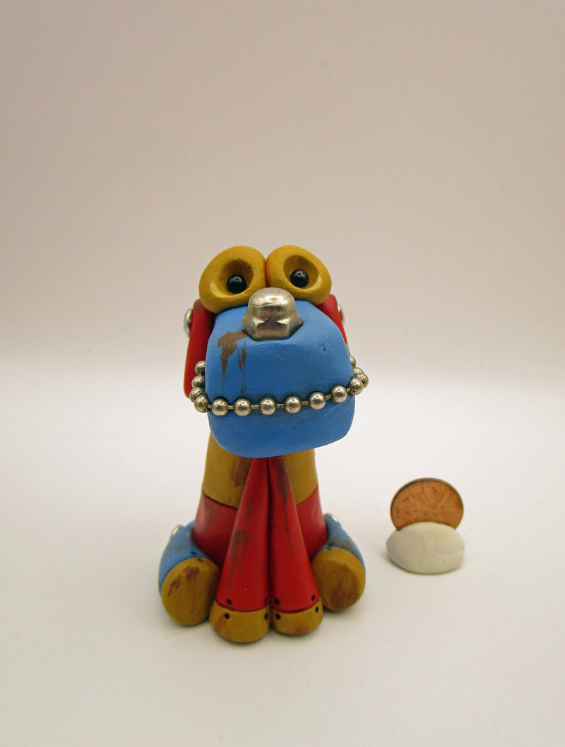This is a great addition to the robot I just added. This listing is ONLY for the robot dog. This pup measures 3.25 inches tall. He's got glass beaded eyes, misc. metal parts, a bead ball chain mouth and retro colors of red, blue and mustard yellow and some painted "rusty" streaks. Check out the last photo so you can see him match up with the robot monster.