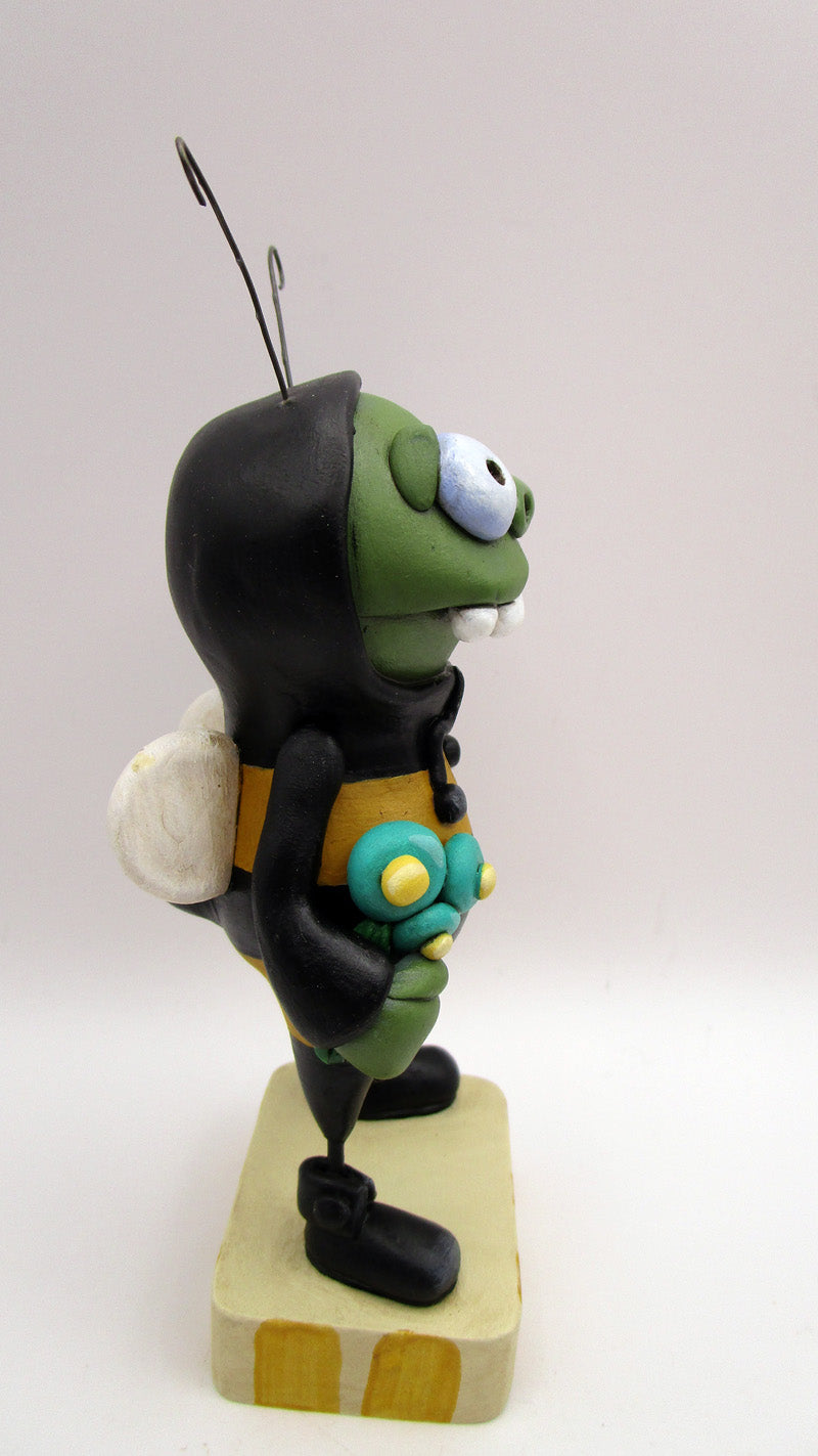 A play on words "zombee"! This zombie character wears a bee outfit as he's anxiously awaiting spring. In his hand is a bouquet of flowers. The eyes, nose and teeth are glossed. Lots of fun going on with this fellow! He's mounted on a hand cut wood base and stands approx 5 inches tall.