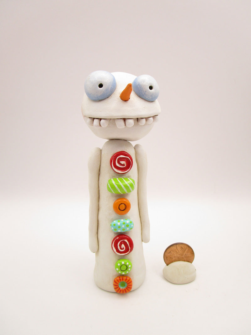 Christmas folk art wacky snowman with wacky teeth and lots of crazy buttons! This piece stands 5 inches tall. He's got a WOOD carved carrot nose, big glossed up eyes and wacky teeth. There are 7 crazy painted buttons!