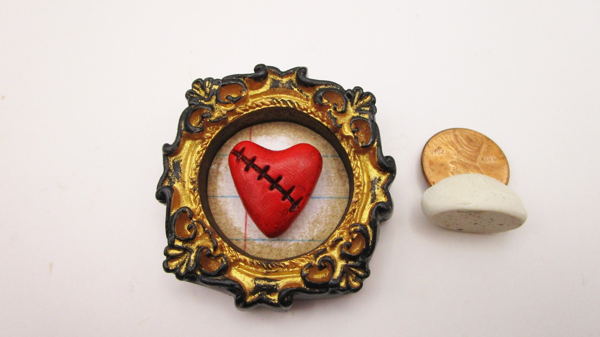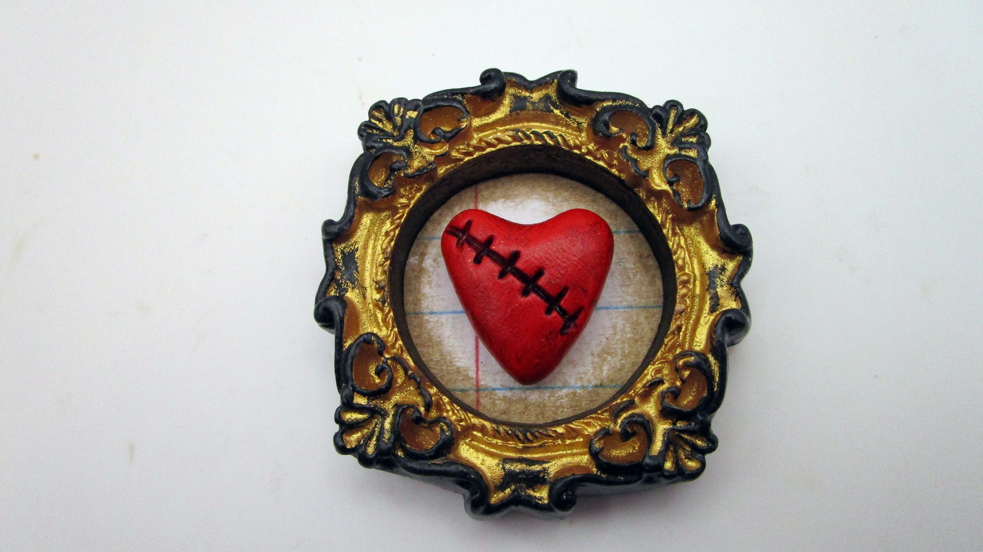 Something a bit different! This is a decorative magnet that features a stitch style broken heart inside a gold and black frame. This can be added to any metal surface for decoration. Not as a holder. It measures 1.75 inches wide and 2 inches tall. Back has two magnets.