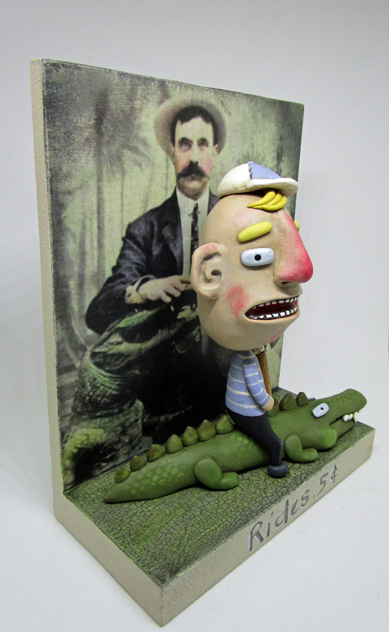 This is number 6 in the limited series of folk art dioramas. Fun piece featuring a boy with cap, holding vanilla ice cream cone riding an alligator. Base reads "Rides .5". The back printed photograph features a dapper man with carnival style straw hat, leaning on a stuff gator. At his side is a boy with similar hat. Swamp and carnival themed. The frame itself was hand cut wood. Base has fine crackle finish.