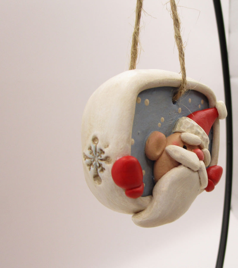 For this holiday season add this piece to your Christmas tree! This measures 2.5 across and just a tad over 1 inch deep. This tree ornament features Santa and a snowy sky. Ready to hang! Sides have a snowflake design. It will be signed on the back upon sale.