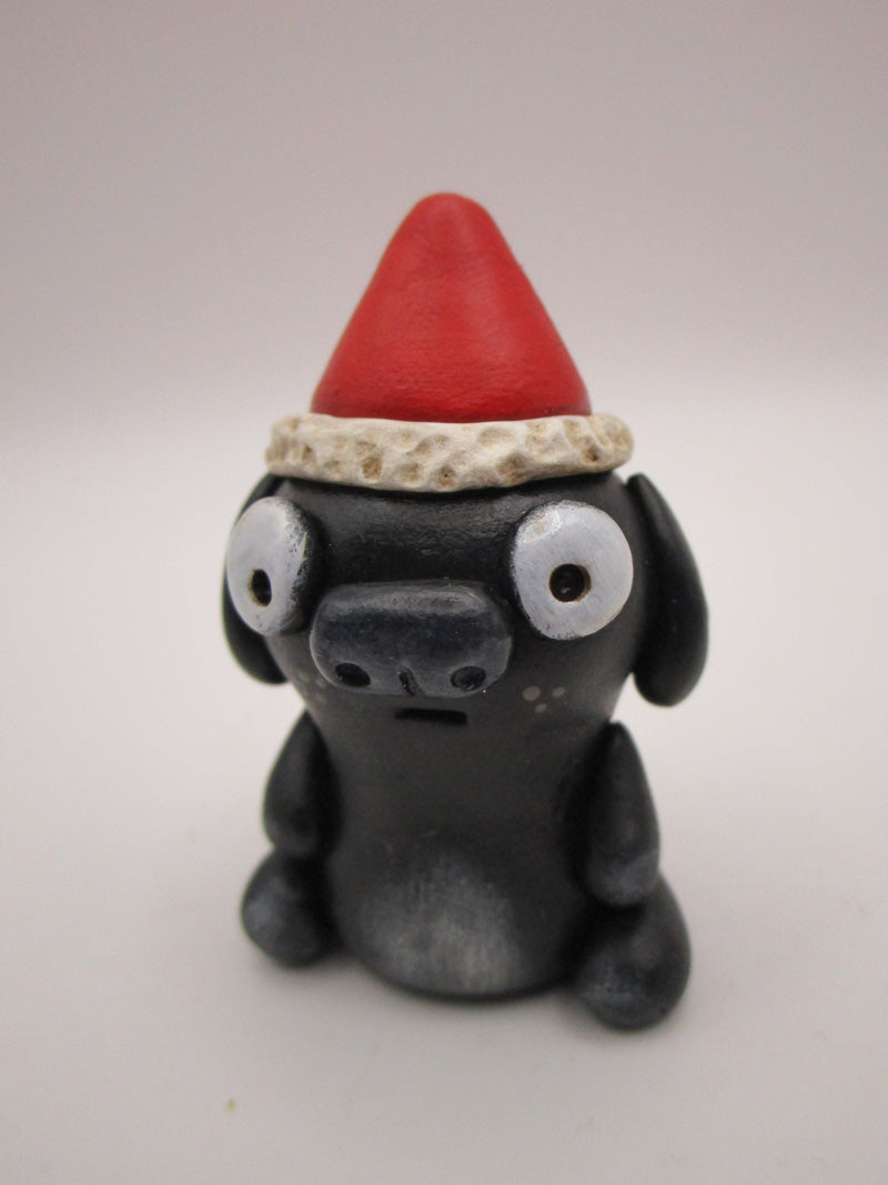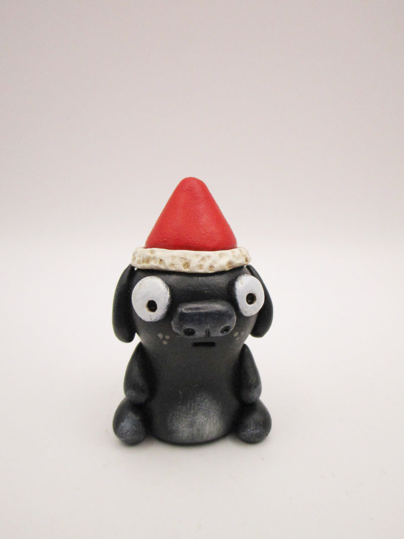 Just shy of 2 inches tall. Cute black pup wearing a Santa hat. Lovely "wet" eyes and nose.