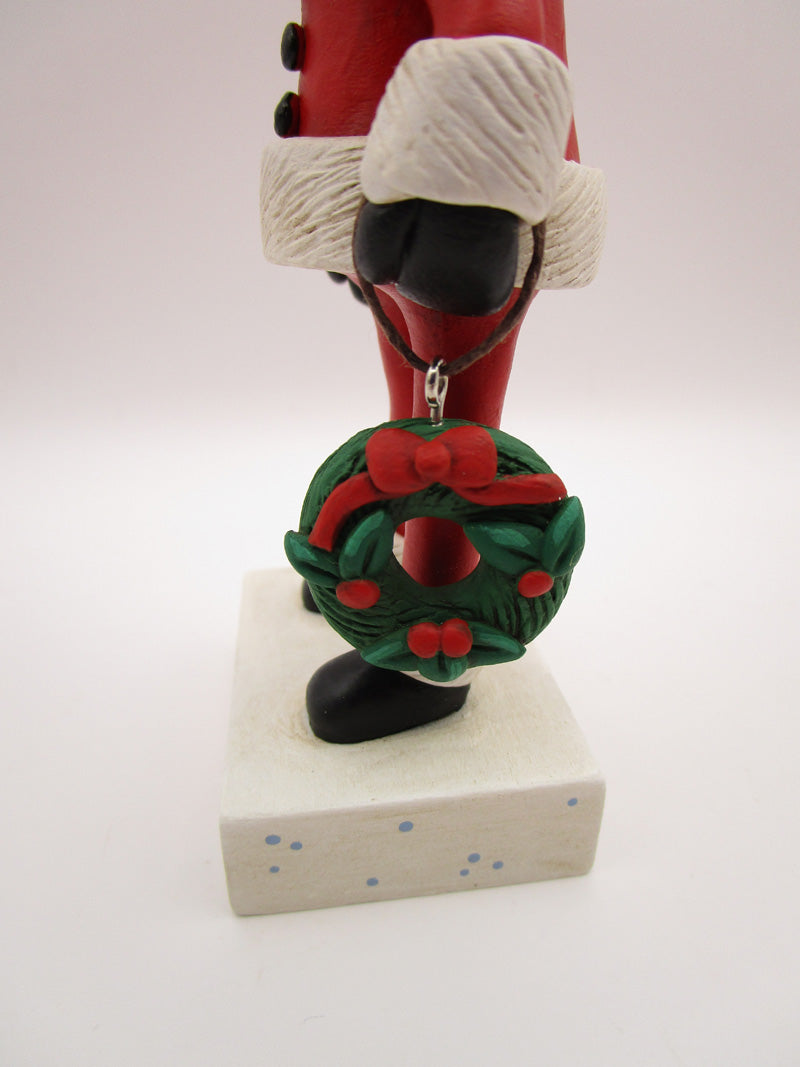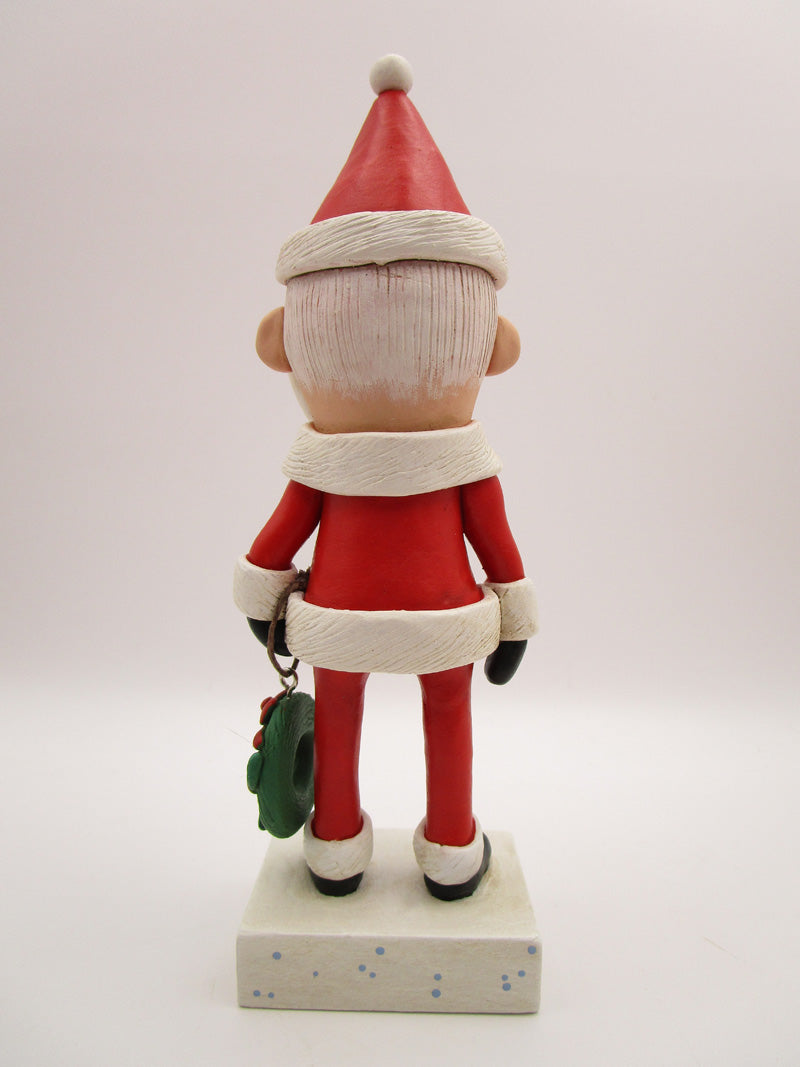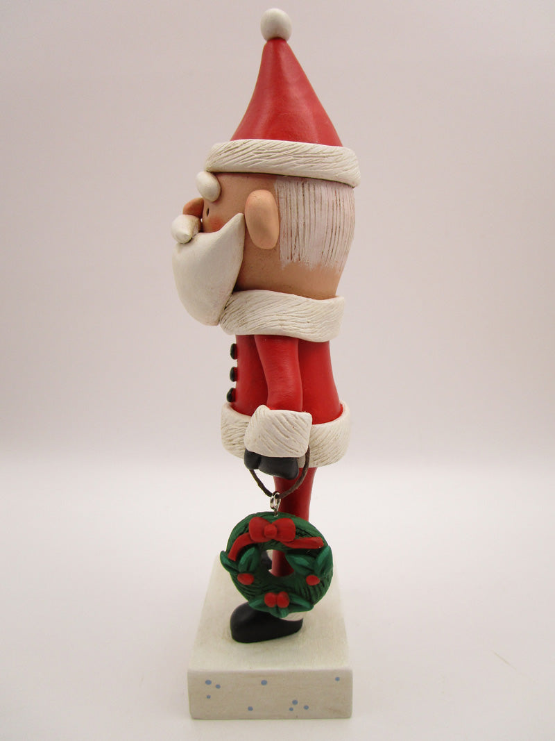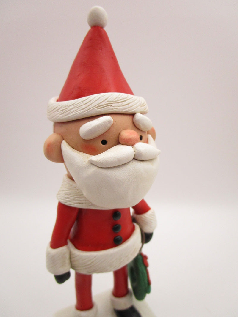 Christmas traditional Santa! This super cute Santa Claus stands 6.5 inches tall. He's dressed in that typical red suit and black boots and mittens. His hat, jacket and pants trim is all textured. In one hand is a Christmas wreath complete with holly berries and sculpted ribbon. The base is hand cut wood and has "BE MERRY" on the front.
