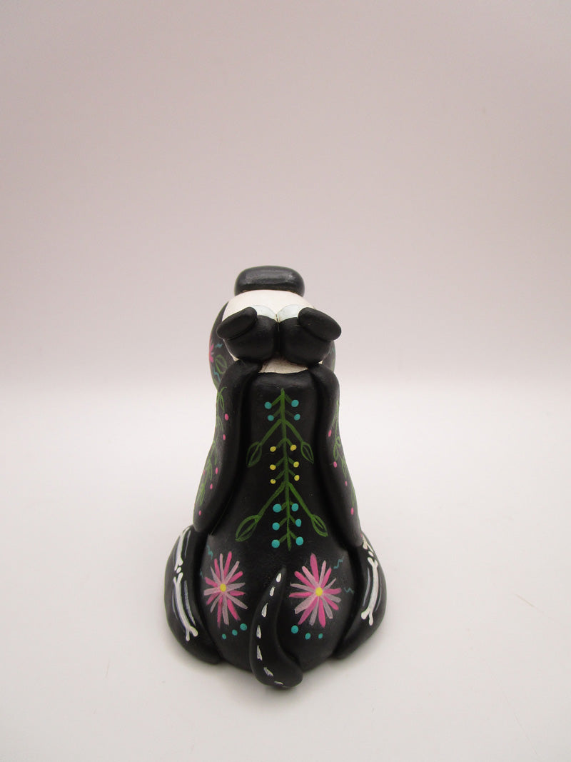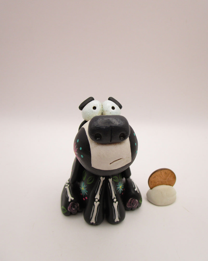Day of the dead dog! I don't do day of the dead as often as I should! This adorable pup is black with a white "skull" shaped face. He's got painted bones, flowers and some other designs. He stands 3 inches tall. His eyes are a faint light blue and glossed up.